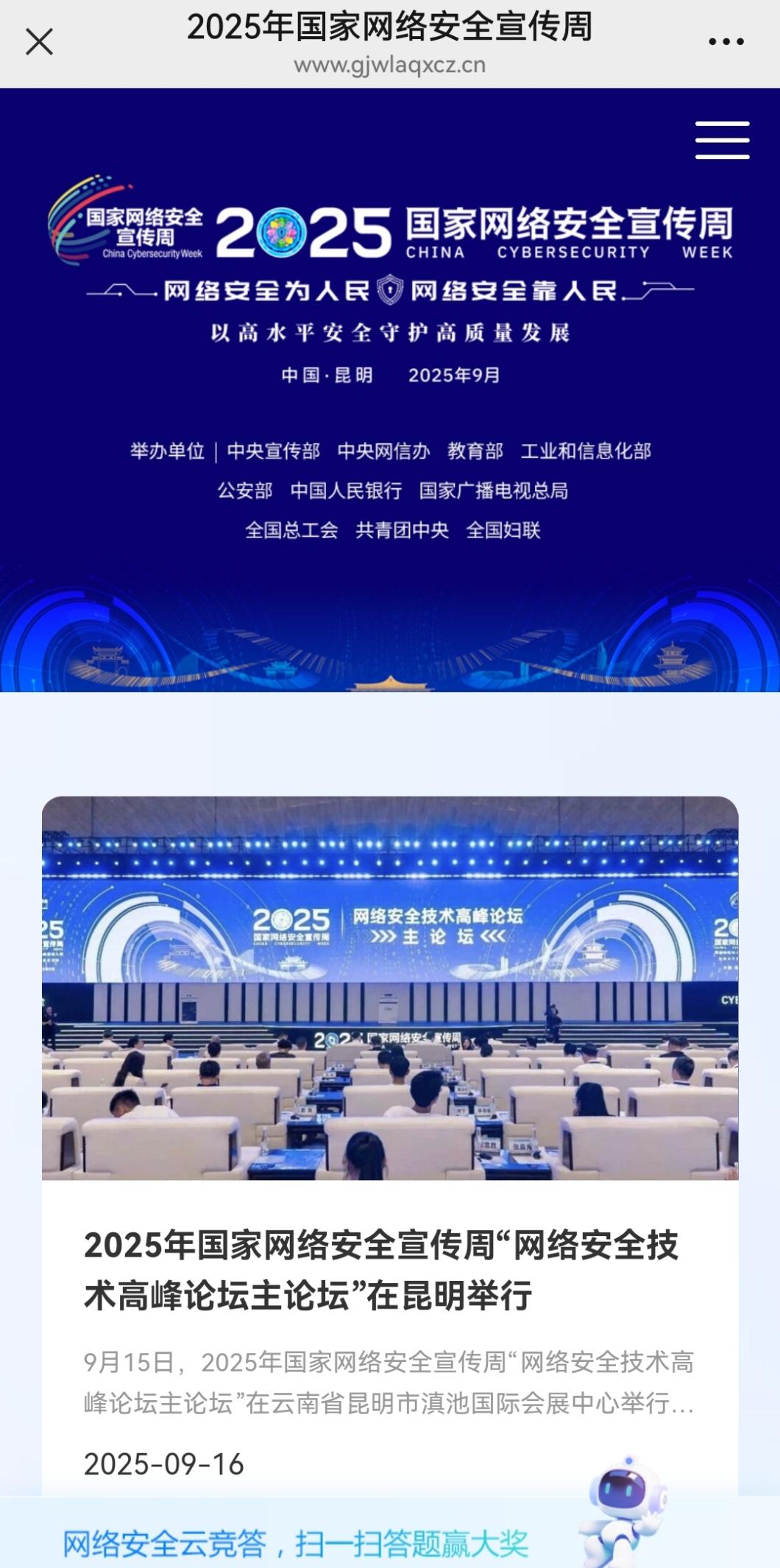 2025年9月15日至21日是国家网络安全宣传周,今年活动主题为“网络安全为人民,网络安全靠人民”,扫描下方海报中的二维码,关注国家网络安全宣传周官方微信公众号,可参与网络安全精彩活动,进入官方网站可获取最新网络安全资讯、学习网络安全知识,提高我们的网络安全意识!